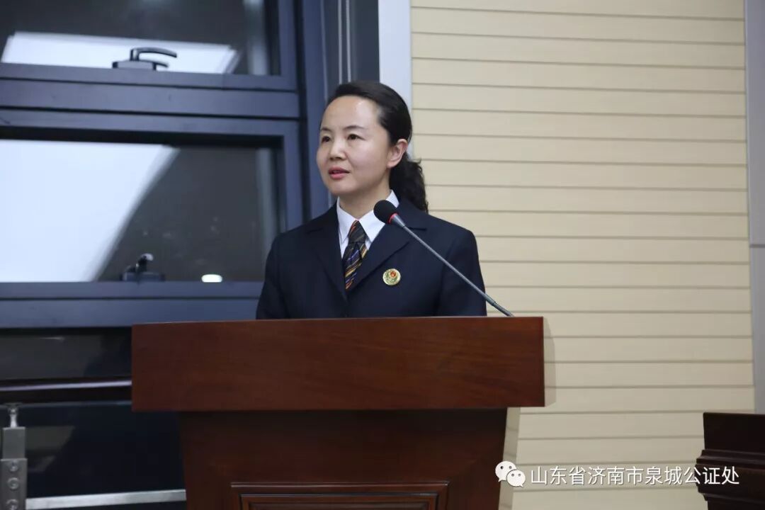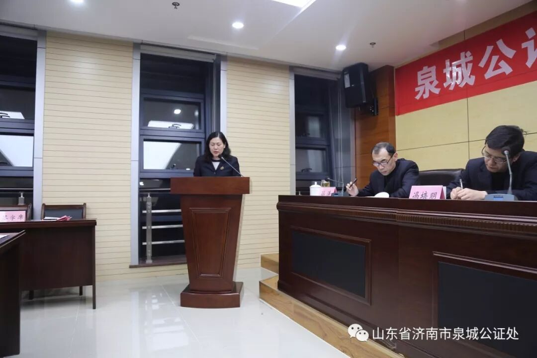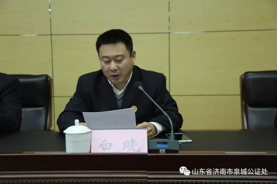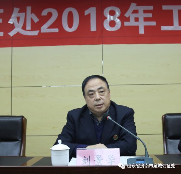 刘景学主任在讲话中指出,2017年泉城公证处在业务发展、队伍建设、便民服务等工作方面都取得了显著的成绩,这些成绩的取得是市局党委和各级业务部门关心厚爱的结果,离不开社会各届的支持和帮助,也是全体泉城公证人共同努力得来的。2018年对泉城公证处来说是巩固改革成果、快速做大做强的关键一年,将2018年确定为泉城公证处“品质提升年”,面对新时代、新情况、新任务,泉城公证处全体人员要认真学习贯彻党的十九大和十九届二中、三中全会精神,积极落实全市公共法律服务体系建设要求,认真落实2018年全市司法行政工作要点,进一步解放思想,创新思路,以“品质公证”品牌创建为目标,重点提升业务品质、公信品质、服务品质和发展品质,在优化业务发展、提高公证质量、提升服务水平、强化便民利民、规范绩效管理、加强公证队伍建设等方面下功夫,为当事人提供有温度、有品质、有特色的公证服务,确保各项工作高质量发展、高水平运作,努力把泉城公证处建设为全国知名、省内一流、济南最强的规模化、品牌化、现代化公证处。